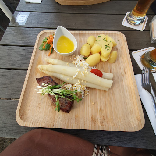 Read moreDer Service ist Spitzenklasse und schnell, die Getränke und Speisen sind auch Blitzschnell auf dem Tisch. Das Abiente fanden wir persönlich nicht so schön, da gibt es bei weitem schönere Restaurants mit Ausblick und nicht so altbacken, Toiletten waren zwar sauber aber so düster und alles aus den 60er/70er Jahren, na ja. Die Getränkekarte ist übersichtlich und für mich dem Ambiente preislich nicht gerecht. Ich hatte das Bigos, was entgegen den bei Google gezeigten Speisekarten, wo Es noch 14,95 € kostete, jetzt 19,95 € kostet. Mir nicht geschmeckt hat, die Räucherwurst okay, aber der Schweinegulasch aus der Keule war trocken und zäh und insgesamt geschmacklich, für, laut Auskunft, eine Spezialität des Hauses, geschmacklich für mich eine Enttäuschung war. Meine Frau hatte ein Mini Rumpsteak Medium, war leider schon drüber und nur im Kern noch leicht rosa, mit angeblich 500g Spargel und auf eigenen Wunsch mit ausgelassener Butter. 3 dicke Stangen Spargel sind auch ungeschält niemals 500g wie angepriesen, sorry, aber das kann ich nicht glauben! Und dafür dann über 30 € zu Verlangen ist unverschämt, siehe Bilder! Immerhin hat es meiner Frau aber geschmeckt. Ich kann nur diese beiden Gerichte bewerten, aber die waren wie beschrieben. Der Beilagensalat beim Bigos war wenigstens lecker und das Weißbrot mit der Schmalzcreme war i.O. Ein zweites Mal gehen wir aber nicht mehr dort Essen. Wegen dem flotten und aufmerksamen Service sind es 3...