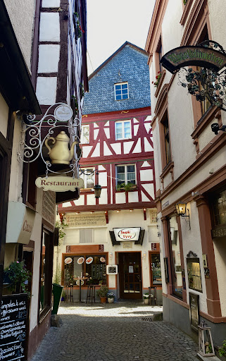 Restaurant Cafe Thiesen, nestled in one of the narrow, historic lanes, SchwanenStrabe, in the picturesque town of BernKastel, offers a charming dining experience. As you step in, on the left side, there's a small showcase for the open kitchen, adorned with a few tables. On the opposite side, the space opens up with numerous tables. The interior is simple and unassuming, featuring long benches against the walls and a brown tiled floor.
