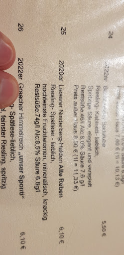 Read moreTop venue. The building is superb! Not too much focus on the flavor profiles of the wines, but their probemenu, their tasting menu is interesting. We did not like the first 5 wines of the dry/feinherb menu, the last one was a 6.5/10. We were with the two of us and glad we order only 1 plank to try. You get like 6 times 0,1 liter. So practically a bottle of wine. We intended to take the auslese tasting menu, but it was a bit much, so settled for a single beerenauslese glass of I thought 2003. Unfortunately also this wine underwhelmed us. For us the wine is not the having the flavour profile and signature we like.