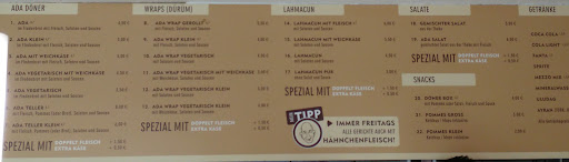 Read moreUns überzeugt, dass ADA in den vielen Jahren seiner Linie treu geblieben ist. Ausschließlich Döner und Lahmacun mit den üblichen Beilagen, alles in guter, frischer, schmackhafter Qualität. Andere Imbisse bieten neben Döner noch Pizza, Pasta und Schnitzel an. ADA hat dies nicht nötig, er weiß, dass er gut ist und das zeigt er in bescheidener Weise. Kurze Wartezeiten, freundlicher Service, moderate Preise. Glückwünsche zum 30 jährigen Bestehen und viel Erfolg für die...