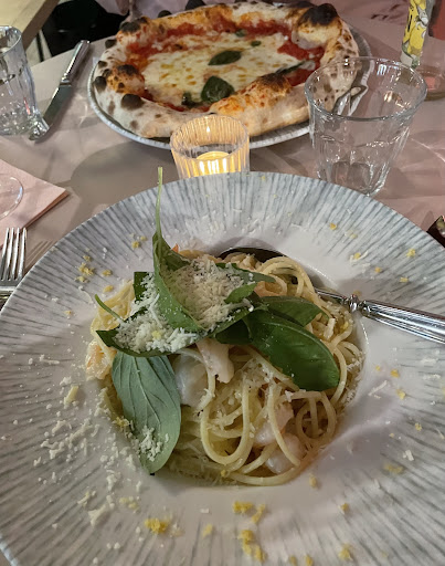 Das Ambiente ist auch wunderschön. Großer Steinofen mitten im Restaurant für die Pizza, moderne Einrichtung usw. Es war lediglich etwas laut, aufgrund der Musik und den vielen Gästen. (9/10) Bestellt wurden Spaghetti al Limone + Garnelen. Das Gericht besteht aus 5 einfachen Zutaten (Spaghetti, Zitrone, Olivenöl, Parmesan und Basilikum). Nach einer kurzen Wartezeit von ca. 20 min kam das Essen auch schon. Das Gericht war sehr schön angerichtet und duftete herrlich. Lediglich die Garnelen hätten präsenter seinen können und etwas mehr Farbe vertragen. (8/10) Die Nudeln waren auf den Punkt, die gebratenen Garnelen und der frische Basilikum haben eine super Textur im Mund erzeugt. Nur einwenig cremiger hätte es seien können. (8/10) Das Zusammenspiel aus Zitrone, Parmesan, Olivenöl, Basilikum und Garnelen haben einen nahezu perfekten Geschmack ergeben. (9/10)