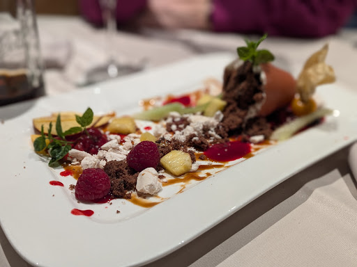Zum Essen: Keine überladene Karte mit zusätzlichen Empfehlungen des Hauses. Wir haben beides probiert, die Spieße vom Schweinefilet mit Pommes und Beilagensalat aus der Karte und die gebratene Leber mit Kartoffel-Parmesan Stampf aus den Empfehlungen. Als Nachtisch gab es den Schoko-Blumentopf mit Mascarpone, Stückchen vom Schokoküchlein, Baiser, Früchten und leckerer Fruchtsoße. Zusammengefasst, es war sehr lecker und auch die Präsentation der Speisen war super wie auf den Bildern zu sehen.