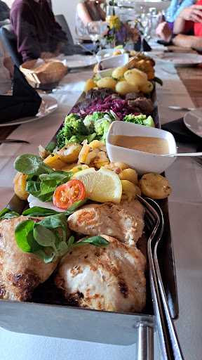 Great food and nice service. We were part of a big group (about 60 people) and after the soup was served at the table the rest of the meal was served buffet style. The staff was attent on both the drinks and food, and added more several times, especially salmon and the salad, but also the meat. The restaurant is friendly to less mobile persons, but the most obvious way from the tram stop has a few steps. There must be another way but I couldn't see it in the dark and as I could do the few steps I did not...