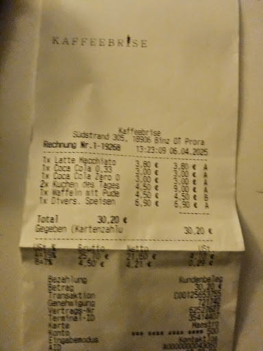Mit vier Sternen erhält die Kaffeebrise eine solide gute Bewertung, die sie absolut verdient hat. Wer nach einem langen Spaziergang eine Gelegenheit sucht, um ein wenig zu entspannen und einen guten Snack zu genießen, ist in der Kaffeebrise genau richtig aufgehoben. Da sich entlang des Prorakomplexes eine Reihe von Cafes befinden, kann sich das Kaffeebrise jedoch nicht durch Individualität abheben. Wir fühlten uns gut aufgehoben und bedient, weshalb wir wiederkommen werden und einen Besuch...