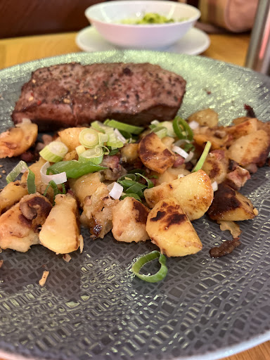 La carne con papas fueron €33 y lo mismo, sin sabor, al punto de tener que ponerle sal y pimienta. El punto de cocción estaba muy rojo y la porción era muy pequeña, no sentimos que comimos.