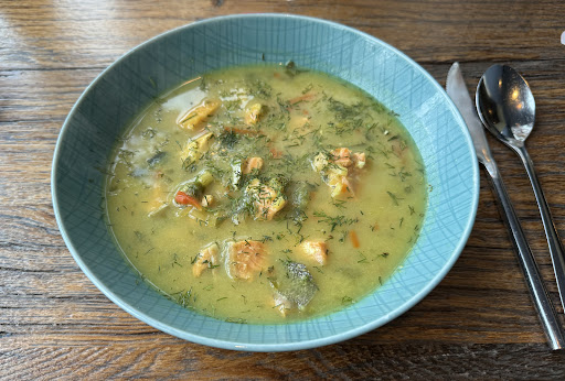 Today we had the fish soup, strawberry and asparagus salad with feta and vinegraitte, the cod, wrapped in bacon with green beans and mash, pasta with burrata and tomato sauce with pistachios and an apple crumble with vanilla ice cream, to share.