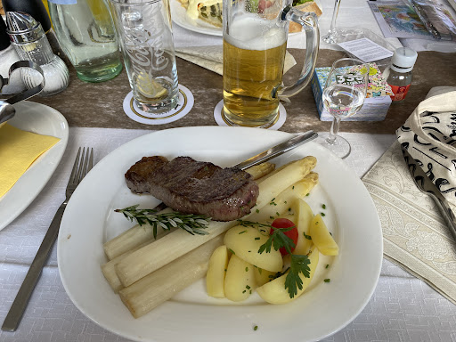 Meine Bestellung: Ich war Teil einer Gruppe von zwölf Personen und bestellte â wie auch mein Sitznachbar â den XXL-Spargel mit Steak. Auf die freundliche Frage zur gewĂŒnschten Garstufe antwortete ich: âLieber keine Experimente â bitte durch!â Dies wurde notiert. Das Ergebnis: ein Steak, das nicht im Ansatz âdurchâ war, sondern höchstens knapp vor medium (siehe Foto). Bis zum AbrĂ€umen hatte ich keine Gelegenheit zur RĂŒckmeldung, da schlicht niemand kam, um nachzufragen. Ich unterstelle: keine böse Absicht, sondern Ăberforderung durch die Auslastung.
