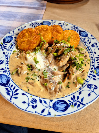 Gasthof: Es handelt sich hier um einen Gasthof mit eigener Brauerei. Zuerst mal, das Bier ist absolut toll. Sehr schmackhaft und angenehm zu trinken. Der Gasthof hat im Außenbereich schöne Sitzmöglichkeiten mit Selbstbedienung. Bei schönen Wetter herrlich. In den überwiegend rustikalen und gemütlichen Gaststuben ist incl. Service. Das Servicepersonal war sehr höflich und auch sehr fleißig. Auch bei vollen Gaststuben wurden Getränke und Speisen sehr schnell gebracht. Die Speisekarte ist deftig fränkisch im besten Sinne. Hier schmeckt es super. Man merkt, dass hier mit frischen Zutaten gearbeitet wird und die Küchencrew ihr Handwerk beherrscht. Das Preis-/Leistungsverhältnis ist absolut angemessen.