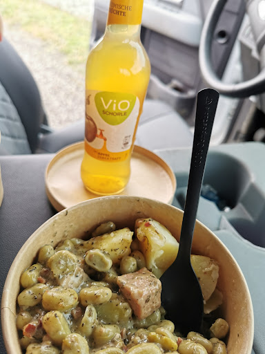 Hausmannskost to go, ein Konzept, das aufzugehen scheint und neben den üblichen Fastfood-Angeboten eine Lücke schließt. Witzig daran ist: man fährt an eben genau so einem Ff-Restaurant vorbei um zum auffällig beschrifteten "Tante Manni" Container zu gelangen. 😄 Das Essen ist schnell in biologisch abbaubare Pappschüsseln abgefüllt, es werden aber genau so gerne selbst mitgebrachte Behälter befüllt. Die Zutaten für die Gerichte kommen nach Angaben der Inhaber aus der Region und sind ohne künstliche Zusätze zubereitet. Die Preise sind durchaus angemessen, die Portionen reichlich. Aber das Wichtigste: es schmeckt wie bei Oma! Auf der Speisekarte steht aktuell: Roulade vom Eifelrind mit Rotkohl und Klößen Gulasch vom Eifelrind mit Kartoffelpüree Eifeler Kartoffelgulasch mit Champignons (vegetarisch) Kartoffel-Möhren-Stampf mit Hackbällchen vom Eifelrind Kartoffelsuppe mit Wiener Würstchen Bohnensuppe mit Speck vom Eifeler Schwein Käse-Hackfleisch-Lauch-Suppe Erbseneintopf mit Eifeler Mettwurst Linseneintopf mit Eifeler Mettwurst und Speck Gemüseeintopf mit saisonalem Gemüse...