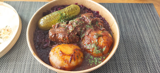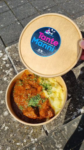 Hausmannskost to go, ein Konzept, das aufzugehen scheint und neben den üblichen Fastfood-Angeboten eine Lücke schließt. Witzig daran ist: man fährt an eben genau so einem Ff-Restaurant vorbei um zum auffällig beschrifteten "Tante Manni" Container zu gelangen. 😄 Das Essen ist schnell in biologisch abbaubare Pappschüsseln abgefüllt, es werden aber genau so gerne selbst mitgebrachte Behälter befüllt. Die Zutaten für die Gerichte kommen nach Angaben der Inhaber aus der Region und sind ohne künstliche Zusätze zubereitet. Die Preise sind durchaus angemessen, die Portionen reichlich. Aber das Wichtigste: es schmeckt wie bei Oma! Auf der Speisekarte steht aktuell: Roulade vom Eifelrind mit Rotkohl und Klößen Gulasch vom Eifelrind mit Kartoffelpüree Eifeler Kartoffelgulasch mit Champignons (vegetarisch) Kartoffel-Möhren-Stampf mit Hackbällchen vom Eifelrind Kartoffelsuppe mit Wiener Würstchen Bohnensuppe mit Speck vom Eifeler Schwein Käse-Hackfleisch-Lauch-Suppe Erbseneintopf mit Eifeler Mettwurst Linseneintopf mit Eifeler Mettwurst und Speck Gemüseeintopf mit saisonalem Gemüse...