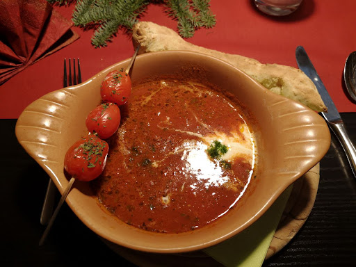 Read moreWaren das erste und wohl auch das letzte mal. Die Bedienung ist sehr nett aber das macht nicht alles aus.Brötchen und Suppe waren lecker und auch sehr nett angerichtet.Die Hauptspeisen waren eher enttäuschend.Hatte Lachs bestellt mit Reis.Es wurde dann gefragt ob ich auch Nudeln nehmen würde...da hatten wir aber auch schon längere Zeit bestellt. Das Besteck ist eine Katastrophe...Steakkabeln für lange Nudeln.Mein Lachssteak war ein Abschnitt Lachs und mittig noch kalt.Dafür total überteuert.Keine kostenlosen Beigaben ...Wenigstens war der Lambrussco lecker