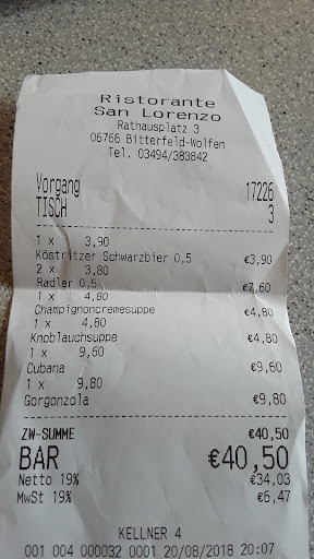 Read moreHaben mal gestern wieder 2 Pizzen bestellt, das positive schnelle Lieferung, Service (Fahrer, Restaurant-Bestellannahme), Pizza super heiß, das wars aber leider auch am positiven, hatten Pizza Ortolana, sollte mit Artischocken, Thunfisch, Zwiebeln und Käse belegt sein, Artischocken war nicht vorhanden (ein paar kleine Stücken) Thunfisch sehr spärlich, dafür sehr viel viel Käse und Pizza Mamma Mia, das gleiche Problem mit dem Belag, sehr spärlich mit den Scampi, aber dafür auch sehr viel Käse und extrem fettig so das die Lieferverpackung davon auch profitierte, nach einer halben Pizza hatten wir einige Magenprobleme, wir haben diese Pizzen schon öfters bestellt und waren bedeutend besser, also sehr enttäuschend für den Preis von 35 Euro inklusive Trinkgeld. Wir bestellen mindestens einmal pro Monat Pizza bei San Lorenzo und müssen feststellen um so teurer die Pizzen werden um so mehr leidet die Qualität in den letzten...