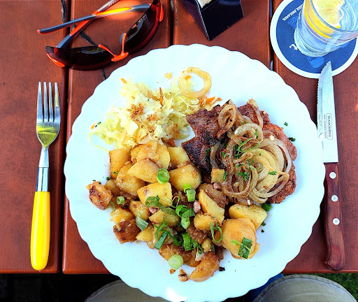 Als Hauptgericht hatte ich panierte Hähnchenbrust mit 2 Löffel Rotkohl, etwas Krautsalat und 2 trockene Klöße, leider ohne Soße serviert.