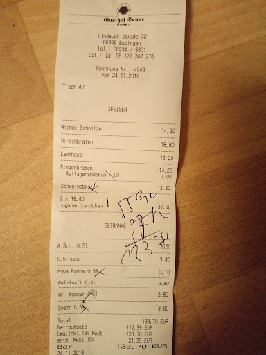Read moreEin Besuch trotz allem wert. Für Bobingen ein schöner ländlicher Gasthof mit Terrassen-Biergarten und schönem Baumbestand. Die Innenräume sind funktionell, aber gemütlich. Die Speisen sind gut, jedoch kann man keine großen Variationen erwarten. Normale Speisen mit guter Umsetzung. So war die Soße zum Rinderbraten nur mit Rotwein angereichert zur fast identischen Soße bei der Kalbshaxe. Das Fleisch war zwar zart, aber schon zu lange geköchelt. Der Salat war angenehm frisch. Dazu ein Lob. Die Bedienung ist freundlich. Man darf nur große Getränke im Biergarten bestellen, was als Schild etwas sonderbar anmutet. Alles in allem 3 Sterne mit einem +....