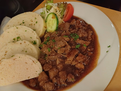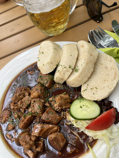 Wir haben hier super lecker, gut bürgerlich gegessen und süffiges Schwerter Helles und Dunkles Bier getrunken. Die Zunge war auf den Punkt gegart, der Spargel hatte noch Biss, super 👍🏼 Die Soße Hollandaise hätte für mich etwas mehr sein dürfen. Das Gulasch super zart, die Serviettenknödel fluffig. Beide Gerichte waren schön angerichtet. Die Portionen groß zu akzeptablen Preis. Wir saßen im Freien wo die Tische ebenfalls sauber und nett dekoriert sind. Eine nette, Bedienung im Dirndl erfüllte unsere Wünsche schnell und fragte immer wieder nach ob alles ok ist! Wir haben unsere Zeit Mitte Mai, mit wenig Touristen...