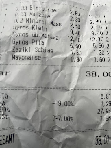 Nach weiteren 35 Minuten, also insgesamt 2h 15min warten war das Essen dann endlich da, jedoch ohne Zaziki auf meinem Gyrosteller!!!