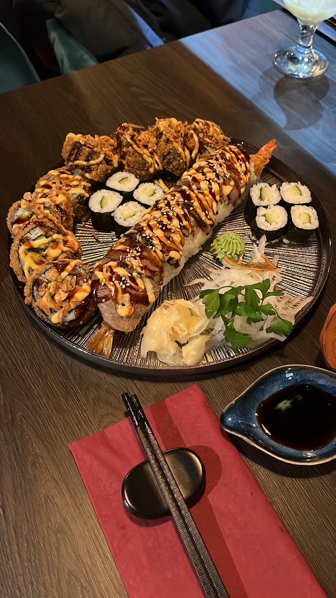 Die Speisekarte lässt keine Wünsche offen. Eine großartige Auswahl an asiatischen Gerichten, vor allem Sushi, sorgt dafür, dass wirklich für jeden etwas dabei ist. Das Essen war nicht nur äußerst lecker, sondern auch die Portionen waren groß. Mein Sushi war so üppig, dass ich mir den Rest einpacken lassen musste.