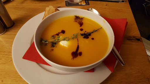 Was recommended to me and is, while nothing unusual, nice and pleasant enough. Friendly was also mentioned but I was unlucky ... the waiter serving us was anything but ... I suppose "duzing" customers in a country where formal address is the default is meant to convey a chilled vibe but overdoing it surely has the opposite effect turning it into a clichee and a fake gesture which comes over as laboured and old-fashioned. I'm sure it can be done in a friendly and charming way - after all the point is to make your customers feel relaxed and at ease - unfortunately the waiter serving us lacked the appropriate skills. Borderline rude overfamiliarity, sarcastic responses to entirely reasonable questions and requests, bellowing, rolling eyes and sloppy service seem to me from the Basil Fawlty school of professional waitressing and customer service and unlikely an integral or obligatory part of the "duzing" policy? With regard to the latter, why not take occasionally a hint from your customer's response or how they address you? It's not an insurmountable challenge to turn down the sheer amount of "du" in communicating with your customer, only basic verbal skills required. Bashing customers with an onslaught till they squirm in their seats to hammer down a point seems to me a rather counterproductive approach if the aim is making them feel comfortable. Also, I quite like to be given a glass with a bottled drink, by no means an unreasonable request, and would appreciate the glass to arrive before the drink has gone flat and warm. Maybe a little bit of additional staff training would help. Last not least, the Bochum friend, a frequent customer who took me here, assured me my experience was not typical and usually the waiters were mostly friendly, courteous and professional. So I...