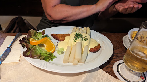 Eine ruhig gelegene Location, wo wir sehr gut gegessen haben. Um 19h hatten wir letzte Woche mit Freunden einen Tisch draussen. Unserem Hund wurde direkt Wasser angeboten. Es wurde regelmaessig nachgefragt, ob wir noch etwas brauchen. Dass das Essen total fettig war, wie hier ein Rezensent schrieb, koennen wir keinesfalls bestaetigen. Der Salat war leicht angerichtet, die Bratkartoffeln die leckersten, die wir je in einem Restaurant hatten und auch das Schnitzel war perfekt - sozusagen saulecker :-) Das Preis-/Leistungsverhaeltnis ist stimmig. Wir kommen gerne wieder, denn die Atmosphaere ist 1A und der Wirt sehr nett. Parkplaetze sind uebrigens ausreichend vorhanden und auch die Toilettenanlage ist modern...