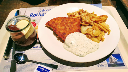 Read moreFader und zu lange gebratener Fisch, trocken und hart an den Rändern. Wenn man die Pannade abmacht völlig ungewürzt, einfach nur ungenießbar. Bratkartoffeln kaum gebraten, dafür pappig. Die fertigen Speisen sind viel zu lange lauwarm gehalten!!! Warum kann man den Fisch nicht frisch gebraten bekommen? Lieblos auf den Teller gelegt von größtenteils unfreundlichen Mitarbeitern. Die Tische werden nach dem Verlassen nur nach Aufforderung gereinigt. Angetrocknete Kringel von den Getränkegläsern und Tellern und schmutzige Tabletts..... Die Toiletten werden nicht regelmäßig auf Sauberkeit überprüft. Kein Toilettenpapier und keine Einmalhandtücher. Alles in allem unzumutbar. Obwohl man alle oben genannten Punkte durch eine gute Geschäftsführung leicht ändern könnte, wenn man seine Leute nur in Griff hätte und vielleicht selbst ein gutes...