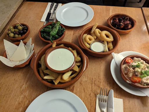 Samstag abends, 20:30 Uhr. Eine größere Personengruppe verlässt gerade das Lokal in einem ruhigen Wohngebiet und wir treten ein in einen Raum im Kneipendesign. Eine nette Kellnerin fragt ob wir reserviert haben und wir verneinen. Nach einer kurzen Prüfung im größeren Nebenraum kann sie uns einen der zahlreichen leeren Tische anbieten. Wir nehmen an einem 2er-Tisch platz, der recht klebrig war. Mit der Bestellung der Getränke erhalten wir die Karte und ein Blatt zum Ankreuzen. Wir outen uns als unkundig in Bezug auf Tapas und erhalten eine kurze und informative Erläuterung zu Hauptgerichten, Tapas, empfohlener Menge und Bestelltechnik auf dem Zettel. In der Karte waren die spanischen Bezeichnungen gut lesbar, bei der sehr klein geschriebenen Übersetzung und Erläuterung und dem schwachen Licht musste die Lupenfunktion im Handy helfen. Klappt alles ganz gut. Das Essen wurde nach angenehm kurzer Zeit gebracht und sah sehr lecker aus. Das Gericht Tomate mit Spinat aus dem Ofen war eine große Tomate mit Füllung aus Spinat (TK in der Spinatsaison?) der Tomatendeckel war auch angeröstet. Der große Tomatenkörper war jedoch kalt und nicht mit ofentypischen Spuren wie Wärme oder Oberflächenbeschaffenheit versehen. Die anderen Gerichte waren lecker und entsprachen den Erwsrtungen, auch wenn die gereichte Brotmenge und die Gesamtmenge von zwei Hauptgerichten, einem großen Tapas-Teller und einem weiteren Ragout nicht dazu reichte, uns zu sättigen. Nach dem Servieren des Essens und dem Abräumen des Geschirrs kam nämlich NIEMAND mehr, um sich nach uns zu erkundigen: weitere Getränke gewünscht? mehr Tapas und mehr Essen nötig? Alles gut? Fazit: leider nicht satt geworden, Essen hat nicht die Erwartung der Beschreibung erfüllt, im...