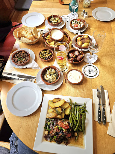 Read moreNach dem Besuch eines großen Möbelhauses in der Nähe stellte sich die Frage, wohin mit uns zum Essen in Bochum-Altenbuchum ... die Wahl fiel spontan auf das "Pablo". Wir hatten natürlich nicht reserviert, weil wir ja 1 Stunde vorher noch gar nicht wussten, ob wir dorthin wollen. Überhaupt bin ich persönlich nicht so ein Freund dieses ganzen "Reservierungshypes". Aber das ist eine andere Frage ... 😉 Mit Ach und Krach haben wir den letzten möglichen Tisch im Pablo bekommen. Zwar drinnen, aber das war uns egal. Danach galt es, die Speisekarte zu studieren. Tapas oder Hauptgericht war jetzt die Frage ... Wir entschieden uns für ein Hauptgericht, nämlich das Rumpsteak Rustico mit gebratenem Pancetta, jungem Knoblauch und Schalotten (für 30€) und mehreren Tapas: U.a. bestellten wir zweimal die Gambas al ajillo (8,5€), das Carne guisada (Rinderragout für 7,5€), das Pollo en salsa de Jerez (7,5€), Higo en vacón (Feigen (!) im Speckmantel für 5,5€) sowie Brot und Kartoffeln mit Aioli. Alle bestellten Speisen kamen gleichzeitig, was natürlich für das gegenseitige Probieren top war. Und - nicht ganz unwichtig - alle Gerichte schmeckten gut bis sehr gut. Die zwei leeren Pils-Gläser auf dem Foto mit den Gerichten wurden übrigens kurz nach der Aufnahme durch voll ersetzt 😉 Wenn man in Bochum ist und Bier mag, sollte man immer Fiege-Biere probieren! Fazit: Ein gelungener und schmackhafter...