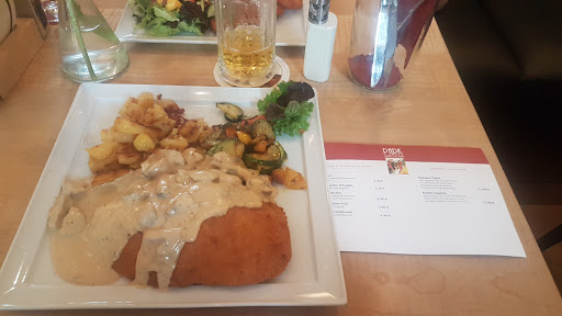 Grundsätzlich ein nettes Lokal und tatsächlich freundliches Personal. Auf Grund der Empfehlungen meiner Vorgänger haben wir uns ebenfalls für Schnitzel entschieden. Schon beim Servieren sah ich, dass das Schnitzel in der Friteuse ausgebacken wurde. Ein Schnitzel das in der Pfanne mit Butter oder Öl ausgebacken wird, ist immer unterschiedlicher Farbe und oft kommt es auch vor,dass es "Blasen" wirft. Demnach war meine Vorfreude etwas getrübt. Nach dem ich das Schnitzel angeschnitten und probiert hatte, würde ich sogar noch einen Schritt weiter gehen, dass Friteusenfett war eindeutig herauszuschmecken, von daher denke ich, dass es sich nicht um besonders neues Fett handelte. Ich probierte unserer beider Soßen, Sie hatte Championrahmsoße,ich hatte Pfeffersoße. Beide Soßen entstanden in ihrer Basis aus Fertigsoßen, die Pfeffersoße hatte zumindest noch einen starken und scharfen Geschmack. Das konnte man für die Champignonrahmsoße nicht sagen. Dadurch dass Champignons aus dem Glas verwendet wurde,war von demEigengeschmack der Champignons leider nicht viel zu merken. Das Gemüse meiner Begleitung (Brokkoli) war mit einer Hollandaise drapiert. Nette Idee,allerdings auch aus Tüte. Gut dagegen,womit ich eigentlich nicht mehr gerechnet hatte, war die Salatgarnitur. In der Karte beschrieben als vollwertiger Salat,hat es gerade mal einen viertel des Tellers eingenommen, somit nicht mehr als eine Garnitur. Dennoch geschmacklich sehr gut. Ob auch hier zu Knorr oder Maggi gegriffen wurde,kann ich nicht sagen. Die Vermutung liegt nahe, aber so lange man es nicht schmeckt, ist es egal. Die Bratkartoffel als weitere Beilage sind ebenfalls positiv zu erwähnen, wenn sie auch etwas krosser ausgebacken hätten sein können. Die Beilage meiner Begleitung bestand aus 5 kleinen Kroketten, auch nicht gerade sehr viel.