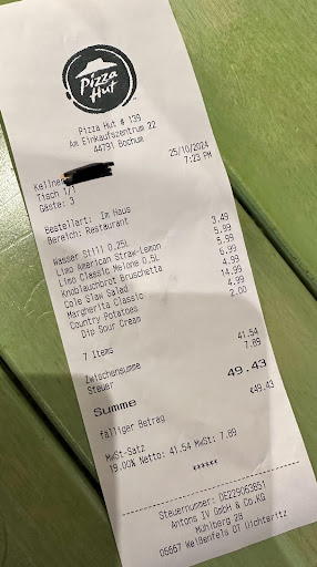 Chronologie eines deprimierenden Abends: Da mich die Bedienung quasi dazu "aufgefordert" hat, schreibe ich nun eine Rezession. An einem Samstag im Januar ´22 haben wir uns entschlossen, nach langer Zeit mal wieder nach Pizza Hut zu gehen. Es war früher Abend und das Restaurant war nicht übermäßig stark gefüllt. Anschließend nahm die Bedienung unsere Bestellung auf. Wir waren 3 Personen und bestellten 3 Pizzen, 2 Softdrinks, 1 alkoholfreies Bier, Knoblauch-Brot und einen Coleslaw-Salat. Während der Bestellung fiel uns auf, dass die Bedienung entweder noch nicht lange dabei ist oder die Produkte, die sie verkauft, nicht wirklich gut kennt. Bald brachte der Kellner die Getränke. 2 Softdrinks, 1 alkoholfreies Bier...und ein alkoholhaltiges Bier. ..... kann passieren, das Bier ging zurück. Danach kam das Knoblauch-Brot...hat geklappt. Anschließend brachte der Kellner einen GURKENSALAT. Okay, ich bin kein Entremetier, aber ein Coleslaw sah in der Vergangenheit anders aus als ein Gurkensalat. Wir teilten ihm mit, dass wir auch das nicht bestellt haben. Der verdutzte Kellner ging zu der uns betreuenden Bedienung, die daraufhin zu einer Person an der Theke ging und sich mit ihm besprach. Dann kam sie zu uns. "Wir haben gerade festgestellt, dass der Coleslaw aus ist." sagte Sie und fragte "ob wir stattdessen etwas anderes bestellen möchten". Wir lehnten ein wenig verwundert ab und so ging sie wieder vom Tisch weg. Irgendwann wurden die Pizzen zum Tisch gebracht......2 Pizzen, aber der Kellner hat auch nur 2 Arme. Die Zeit verging, meine Familie fing an zu essen, da es sonst ja kalt wird. Meine Frau sagte noch im Scherz (oder war es doch keiner), dass die bestimmt meine Pizza vergessen haben. Sie sollte richtig liegen....es blieb bei 2 Pizzen. Manchmal hat man ja das Glück und die Bedienung kommt zwischenzeitlich mal vorbei und fragt überfreundlich nach dem "Befinden". Ich denke, sie hat es aus Rücksicht unterlassen, da ich mir ja ein paar Stücke bei meiner Familie schnorren konnte. Zum Bezahlen war sie aber dann zum Tisch geeilt. Es folgten die allseits bekannten Worte: "War bei Ihnen alles in Ordnung?!?!?!" Leider tat meine Frau ihr nicht den Gefallen und antwortete mit dem obligatorischen "Ja, vielen Dank". Sie hat vielmehr auf das vorangegangene hingewiesen, worauf die Bedienung wieder zu einem Mann am Tresen gegangen ist und sich mit ihm besprochen hat. Sie kam wieder zum Tisch und sagte uns folgendes: "Ja, das haben wir bereits gemerkt und eine Pizza nicht gebongt." Wir schauten uns ungläubig an. Das hat sie jetzt nicht gesagt, dass sie es gemerkt haben..... Sie sagte es mit einer Überzeugung uns damit auch noch einen Gefallen getan zu haben. Eine Entschuldigung oder Geste kam dabei nicht rüber. Kein Angebot eines Getränkes, Cookies oder was auch immer. Auf meinen Kommentar, dass es ja auch soziale Medien gibt, auf denen man seine Meinung äußern kann, sagte Sie "ja machen Sie das." Und damit habe ich ihren Wunsch hiermit erfüllt. Ich bin dann zum Bäcker und habe mir ein Streuselplätzchen geholt....ist ja auch sowas ähnliches wie ein...