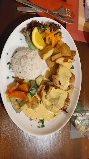 Rosmarin Hähnchen (14.90): In der Karte wird beschrieben, dass das Gericht mit Orangensauce und Datteln serviert wird. Vom Hähnchen ist auf dem Teller zuerst nicht zu sehen, es verschwindet völlig unter einer großen Menge kurkumagelber, entschuldigung, Pampe. Die Sauce wird offensichtlich auf Basis ein Roux Blanc hergestellt und dickte mit zunehmender Abkühlung stark ein. Am Tisch hatte sie eine Konsistenz von Pudding. Mir ist bewusst, dass in der arabischen Küche viel mit süßen Aromen gearbeitet wird, hier ist es völlig missglückt und ungenießbar gewesen ist (sei es nun als Sauce oder als Pudding). Keine Säure, keine Schärfe, zu wenig Salz, kein Aroma und viel zu süß. Der Service bestätige eine entsprechende Reklamation. Viele Gäste würden das Gericht für viel zu süß halten, es sei halt deftig. Und ausserdem würde das am vielen Marzipan in der Sauce liegen.