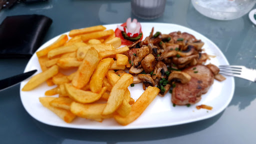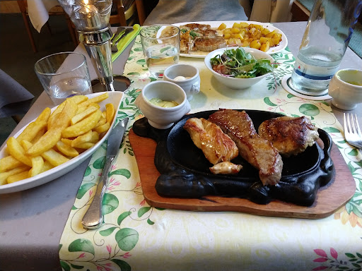Vorab wurden zwei Scheiben Brot mit sehr guter Kräuterbutter (selbstgemacht?) serviert. Ich hatte Schweinemedaillons mit Pfifferlingen in Rahmsoße und dazu Röstkartoffeln (Bratkartoffeln). Das Fleisch war sehr zart, die Soße war köstlich und auch die Bratkartoffeln waren knusprig. Mein Partner hatte die Grillpfanne mit Rind, Schwein und Huhn mit Kräuterbutter, dazu Pommes mit Mayo und Salat. Das Fleisch wurde auf einer heißen Gussplatte serviert, wodurch es weiter brutzelte. Das Fleisch war auch sehr köstlich. Die Beilagen konnten ohne Probleme gegen andere getauscht werden, was ich sehr positiv fand. Hab ich tatsächlich schon anders erlebt, deshalb hebe ich es hervor.
