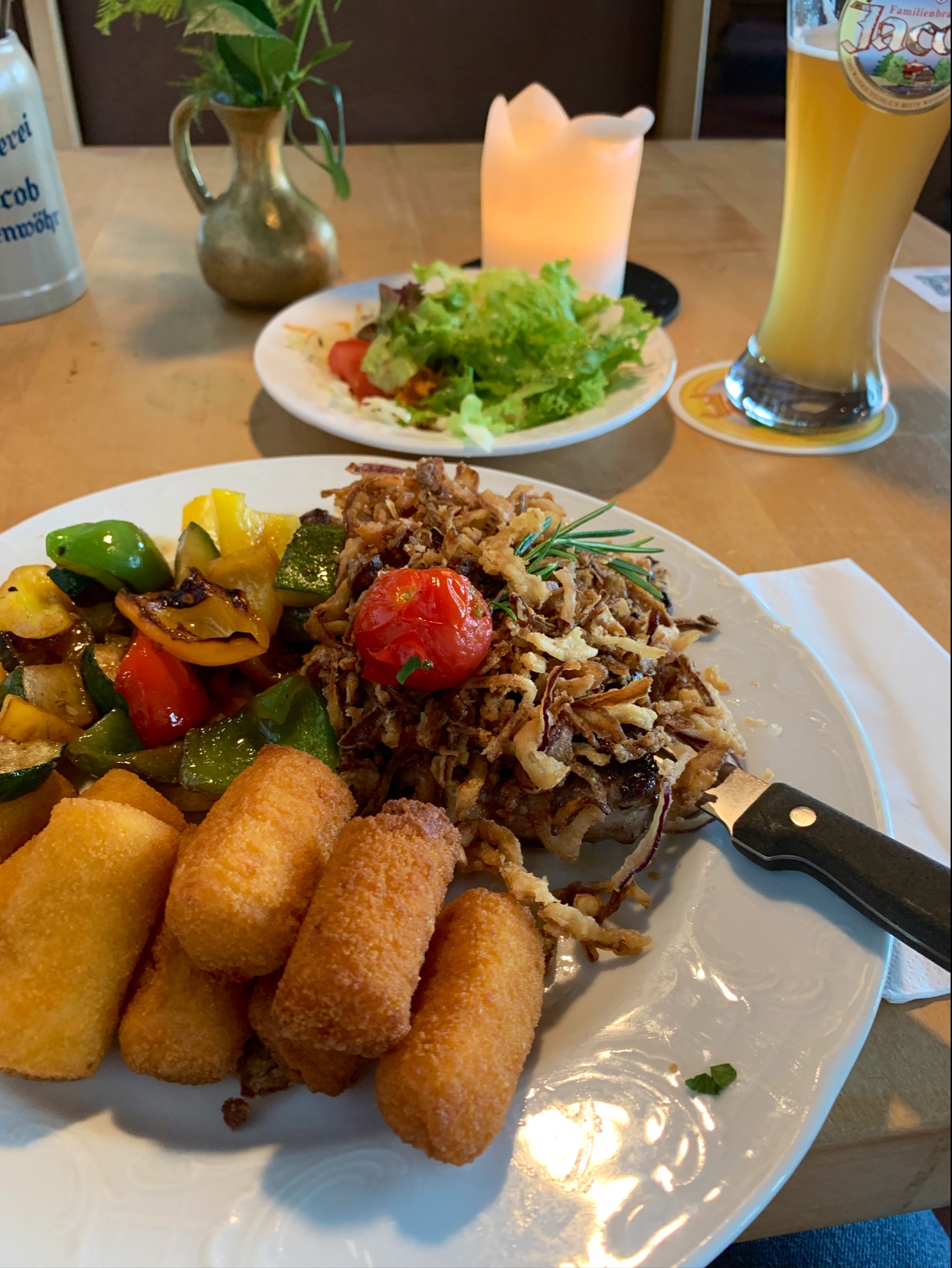 Seit ein paar Jahren komme ich meist bei meinen Geschäftsreisen in die Familienbrauerei Jacob. Es ist ein überaus sauberes und sehr übersichtliches Hotel in einem tollen Landhausstil in perfekter Lage in Bodenwöhr am See. Die Betten sind sehr bequem und der Ausblick vom Hammerseezimmer einfach nur schön und entspannt. Sowohl in den Zimmern als auch im Restaurant wird auf Sauberkeit sehr großen Wert gelegt. Das kleine aber übersichtliche Frühstücksbüffet ist geschmacklich hervorragend. Vor allem die leckeren Spiegeleier die auf Wunsch frisch zubereitet werden sind sehr vorbildlich. Was ich noch persönlich gut fände, wäre normalgrosse Croissants und Geflügel Aufschnitt. Das Restaurant selbst ist ebenfalls hervorragend. Hier kann man sehr vorzüglich Speisen und vor allem, wirklich das beste Weißbier der Welt trinken. Ich bin jetzt nicht all zu großer Bier-Fan. Aber Leute … diese Bier … Taste it. Sehr oft gegessen habe ich das Schnitzel im Biermantelteig und der Zwiebelrostbraten. Hierfür gibt es insgesamt ganz klare 5 Sterne.