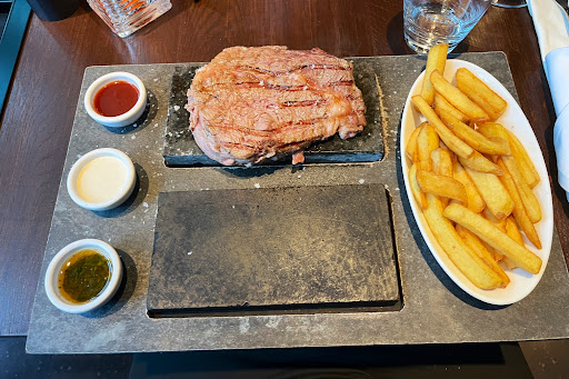 As Main course an Entrecôte from Uruguay and a Us rib eye. U make these to your liking as the stone it comes on is HOT, you can cut and place it on the stone underneath (see picture) to not let it bake any further.