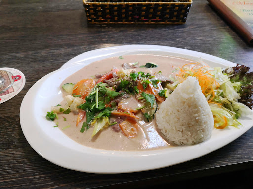 Ich finde das Essen nicht überzeugend. Die Soße überdeckte alles und die Menge an Gemüse und Fleisch war enttäuschend gering. Zu allem Überfluss war die Soße, die nach Erdnuss schmecken sollte, geschmacklich weit davon entfernt. Trotz des wunderbaren Service kann ich nur 2 von 5 Sternen vergeben, da das Essen eine wesentliche...
