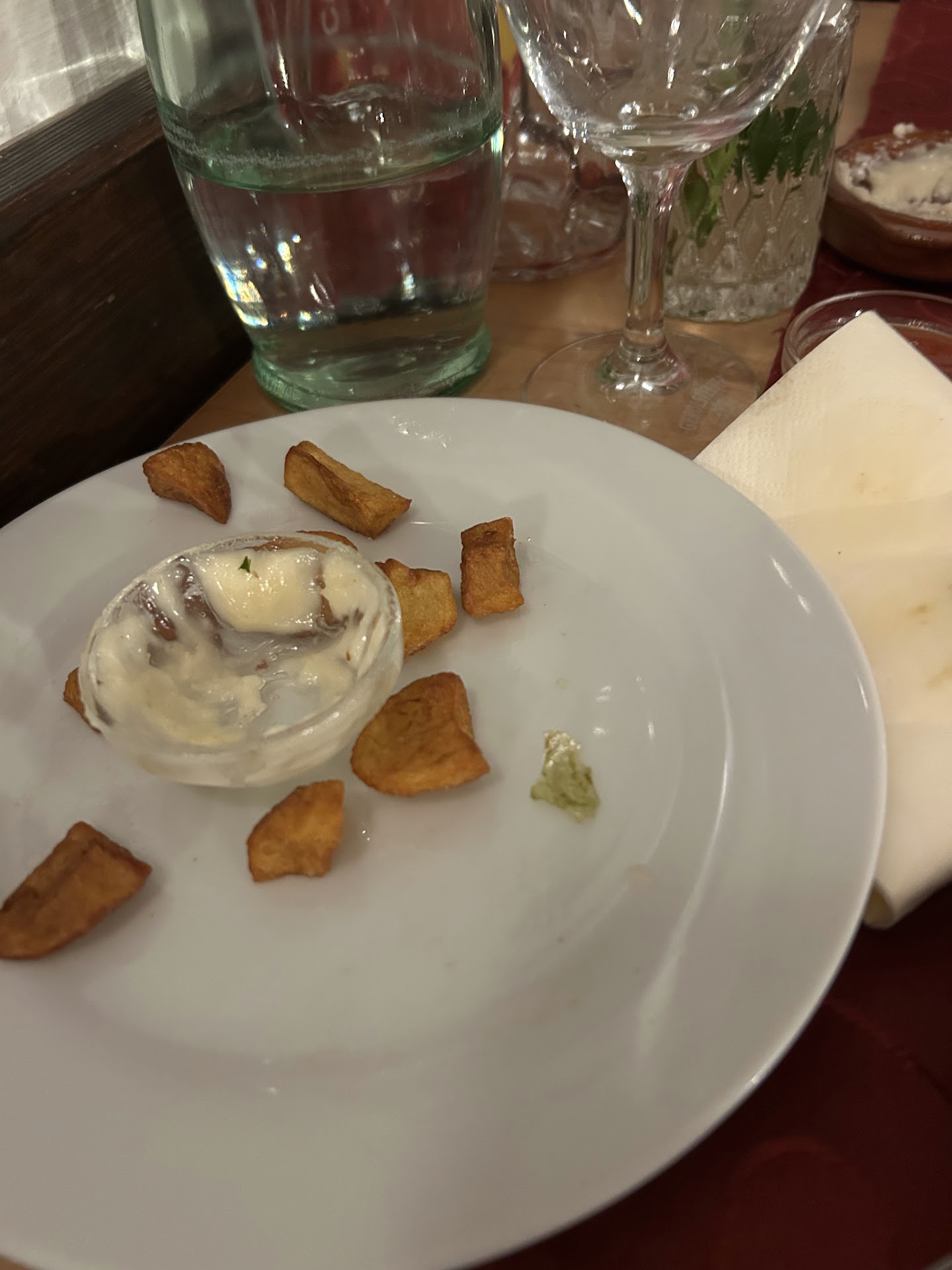 Negativ: Das Brot kam schnell, aber unterstützt leider das Bild des Ambientes: lieblos. Eher Aufback Baguette, das aufgeschnitten wurde. Was für mich ein absolutes no go ist, ist, dass die einzelnen Tapas alle mit großem zeitlichem Abstand nacheinander zum Platz kommen. So kam beispielsweise bei uns das Fleisch als erstes, dann nach circa 5 Minuten eine weitere Tapas Speise und so weiter. Das ist total blöd, denn das schöne am Tapas Essen ist für mich, dass man von allem ein wenig nehmen kann. Wir haben dann gewartet, bis zumindest fast alles am Platz war und bis dahin war das Fleisch schon wieder kalt. Das ist auch ehrlich gesagt das erste Mal, dass ich das so erlebt habe beim Tapas essen. Ich finde dann warte ich lieber länger und habe dann das gesamte Essen auf einmal am Platz. Das Fleisch hatte außerdem sehr schlechte Qualität. Einzelne Stücke am Rinderspieß waren noch roh (siehe Bild). Ich mag wirklich gerne Medium, aber das war schon weit darunter. Im Gegensatz dazu waren andere Stücke so knorpelig, dass wir das Fleisch ausspucken mussten. Die Hackbällchen waren viel zu stark angebraten. Sie waren hart von außen und im Inneren Trocken. Die Sauce hat uns auch nicht so geschmeckt. Die Pilze waren zwar lecker, aber so voller Knoblauch, dass es uns fast umgehauen hat. Wir sind beide wirkliche Knoblauchliebhaber, aber da waren ganze Stücke vom Knoblauch grob geschnitten drin. Etwas übertrieben finde ich. Die grünen Paprikas hingegen waren sehr lecker, ebenso wie die Kartoffelecken mit Aioli. Allerdings war bei mir im Aoili etwas nicht identifizierbares durchsichtiges (siehe Bild). Ich hoffe einfach, dass das Ei Reste sind und kein Plastik. Was man allerdings wirklich hervorheben muss ist, dass das preislich eher günstig für die großen Mengen ist.