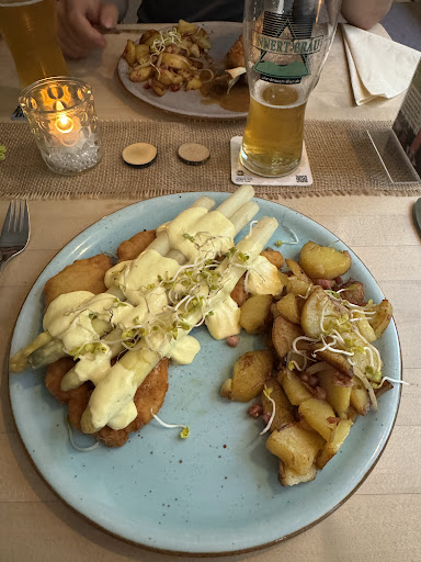 Read moreWir waren am 4.1.25 spontan um 19.15 Uhr mit 6 Personen da. Das Ambiente war wie immer nett und das Personal freundlich und relativ aufmerksam. Ich hatte mir den Schweinbraten mit Bratkartoffeln bestellt. Leider waren die Bratkartoffeln furchtbar. Entweder waren die Kartoffeln verbrannt und die wenigen hellen sehr trocken und völlig geschmacklos. Auch die Röstzwiebeln waren so dunkel dass sie zerbröselten. Nach etwa 10 Minuten kommt eine der Servicekräfte und stellt eine kleine Schale mit neuen Bratkartoffeln auf den Tisch mit dem Kommentar "Wir haben ja gesehen, dass die Bratkartoffeln zu dunkel sind." Da frage ich mich, wenn man gesehen hat, dass die Bratkartoffeln zu dunkel sind, warum sind die so raus gegangen. Wenn mich die Servicekraft gefragt hätte, ob ich etwas Neues möchte, hätte ich gerne ein paar Pommes gehabt. Die Bratkartoffeln waren mir vermiest. Somit habe ich die Bratkartoffeln abgelehnt. Der Schweinebraten war ganz gut, nur leider war die dunkle Biersoße total versalzen. Um das zurück gehen zu lassen war ich zu hungrig. Auch meine "Mit-Esser" fanden die Soße zu salzig. Beim abräumen habe ich das auch gesagt. Es kam allerdings keine Reaktion. Weder eine Entschuldigung noch ein Schaps aufs Haus, ein Preisnachlass oder ähnliches. Das fand ich sehr schade. Bisher haben wir immer sehr gut dort gegessen. Ich hoffe das es nur ein schlechter Tag...