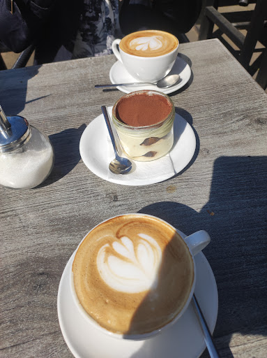 They serve salads, ciabatta sandwiches, and pizza. They also have coffee and some desserts like Tiramisu and sometimes croissant or cake. The selection of food and drinks is quite impressive and delicious.