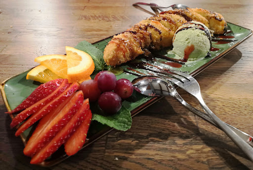 Nach einer gebratenen Banane mit Honig und Matcha-Eis (7€) sowie nett mit Früchten dekoriert, brachte der engagierte Service die Rechnung. Kartenzahlung ist derzeit nicht möglich, dafür ein kleiner Abzug in der B-Note, PayPal geht allerdings.