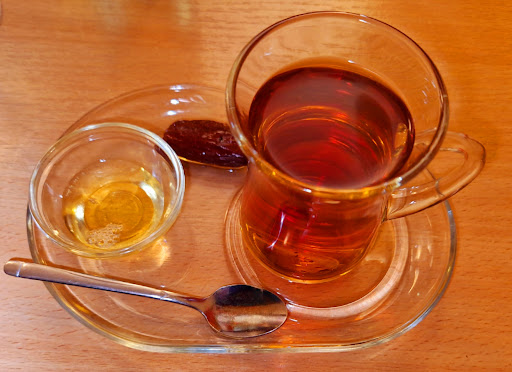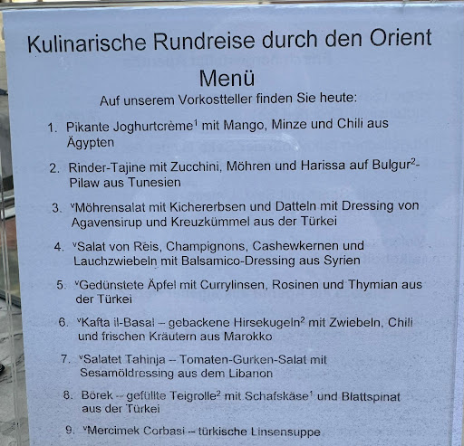 From our selection of 9 items, I chose: Lamb Ragout which was ordinary. The meat was bordering on the tough which is surprising for a long cooked dish. The Oriental paprika cream soup was enjoyable. The falafel were awful - no salt for pity’s sake, did the chef actually taste one? The Börek were nice, light and crispy and popular, but each time you ordered them you only got one which made me wonder if it was a tactic to reduce the number you ate. The Egyptian rice with pasta dish looked interesting but was a bland and inconsequential. The Iranian melon and goat's cheese salad was nice and refreshing and another spicy salad dish was good too.