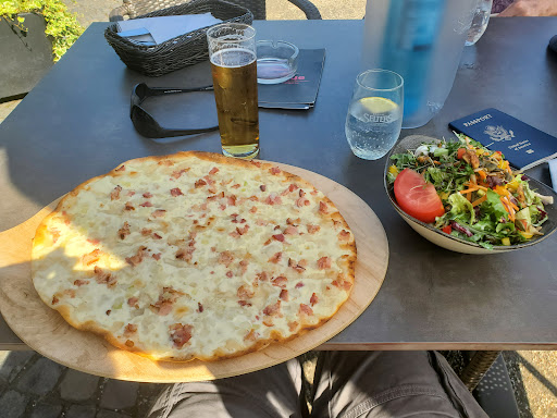 Charming Biergarten in the heart of the Rheinaue Park. There was some construction going on, but views of the Rhine River and surrounding mountains were still breathtaking. Kitchen is closed 14:30-18:00, but two food options were available. We were served a salad and thin crispy cheese bread with bacon and onions. Salad was great - quality lettuce and diverse ingredients, including some pumpkin seeds. Cheesy bread paired great with the beer. It was a hot day so my lager beer didn't stay cold long, so I ordered a delicious Aperol Spritz with rhubarb - a refreshing summer drink.