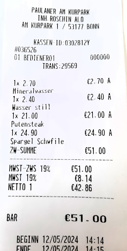 Read moreRead moreTja, da haben wir dann ja wohl voll daneben gelegen ( höflich ausgedrückt ). Waren vor ein paar Tagen in Bonn beim Paulaner und dachten " na da kannste ja nichts falsch machen ". Ich weiß nicht warum sich diese " Lokalität " den Namen Paulaner auf die Fahne schreiben darf. Hat mit einer bayerischen Gastwirtschaft überhaupt nichts gemein. Rezensionen, die das Paulaner als "urig" und mit "tollem Essen" beschreiben, sind für mich absolut unverständlich. Ich habe in den ganzen 14 Tagen unseres Urlaubs hier in der Eifel nirgends so ein schlechtes Essen bekommen. Aber wir hätten beim Betreten des Ladens schon stutzig werden sollen. Kein Mensch außer wir, auch die vielen Plätze draussen maximal 3 Personen bei einem Getränk. Während der Wartezeit habe ich dann mal ein büschen gegooglet. Die Rezessionen waren eine Katastrophe und sollten sich bestätigen ! Meine Frau frischer Spargel mit Schweinefilet, Salzkartoffeln und Sauce Hollandaise = 24,90 €. Ich Putensteak mit Champions und Rahmsoße, Kartoffelkroketten & gemischter Salat = 21,00 €. Nach der abschließenden Frage ob es geschmeckt hat, war unsere Antwort NEIN. Frage der Chefin : warum ? Antwort : Weil beim Spargel von 5 Stangen 3 Stück komplett roh war Chefin : man konnte ja nicht wissen das man den Spargel gekocht haben wollte !? So eine dummdreiste Antwort hat mir die Sprache verschlagen. Zum Glück war das Fleisch wenigstens gebraten 😠 Meine Champingnons waren Schnitzelware, Aldi 3. Wahl, Dose 79 Cent. Unmöglich.... Die Kroketten innen total matschig, daß Fleisch völlig trocken ( wahrscheinlich beides Friteuse ). Habe Pilze, Kroketten und Soße lieber nicht gegessen. Der dazugehörige Salat wurde völlig vom Essig / Öl Dressing überlagert. Zum krönenden Abschluß wurde meine Selter im offenen Glas serviert ( 1,5 l Mehrwegflasche Aldi 30 Cent ?? ) Hier das Glas 2,70 €. Für den ganzen Spaß haben wir dann 51 € bezahlt. Die beiden Bilder nach der Rechnung, da sah alles noch ganz manierlich aus. Das andere ging alles zurück... Wir sind noch nie so...