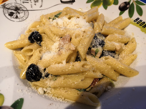 Es ist eine sehr gute Pizza mit Restaurant Standard . Alle zutaten sind Frisch, auch bei der Bruschetta war Frisch zubereitet, das Brot war Geschmackvoll und Knusprig, ein mal war etwas zu Knusprig und in die Kanten etwas verbrannt, hat aber trotzdem geschmeckt(siehe Foto) . Mein Mann aß die Tortellini mit Sahne und Schinken und ich eine Pizza Savoy (mit Tomaten und Schwarze Oliven) Siehe Foto. Alles war sehr lecker, obwohl die Tortellini eine sehr kleine Portion für ein Mann sind. das einzige was ich als Störend bezeichnen kann ist die Atmosphäre. man Spürt mehrmals in eine Stunde der DB der genau oben vorbei fährt.