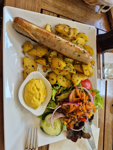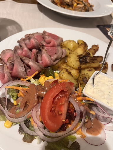 Der Salat (großer Beilagensalat) war etwas lieblos und für den Preis eher klein, das dazugereichte Brot hat mich an ein Baguette vom Discounter erinnert. Das Dressing sollte Balsamico beinhalten, was wir nicht herausgeschmeckt haben. Wir wurden leider nicht nach dem Dressing gefragt und ich hatte es aufgrund der Wartezeit bis zur Bestellung vergessen direkt zu erwähnen, sonst hätten wir Joghurt bevorzugt. Der Burger sah traurig aus (Vielleicht kommt hier auch der Name "Smashed" Burger her) und hatte ein sehr flaches Patty, dazu gab es Pommes (nicht selbstgemacht). Geschmacklich war der Burger enttäuschend und sein Geld nicht wert. Das Schnitzel sah gut aus, es war insgesamt jedoch nur wenig Fleisch auf dem Teller (insbesondere bei dem Preis von 25€ zu wenig). Die Bratkartoffeln waren leider größtenteils verbrannt und das Schnitzel war sehr ungleichmäßig gewürzt - ein Stück hat nach nichts geschmeckt, ein anderes Stück war vor lauter Salz ungenießbar.