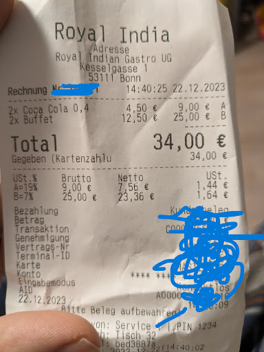 Is it called buffet!! Three types of similar chicken curry, three types of daal, two kinds of rice, one normal and one colored. There was a fish item and one dessert item, but no fish existed. Apart from this, they provided an extra 1 Naan per person. That means we went there to have chicken daal rice as a buffet. The food was very average. When we entered, before taking a seat, the waitress asked us what we wanted to take, and when we told her we wanted a buffet, she asked us which drinks; we usually told her Coke. We were surprised after getting the bill. A 250 ml glass of Coke costs 4.5 euros. Seriously!!! I visited more than 500 restaurants in Germany; I never got disappointed like that. I don't know what their other items are, but the buffet is a kind of a scam; if you spend 15 euro, you will get 40+ buffet items in the Cologne Bonn area. I would never pay 12.5 euros for an average Rice, Daal, or Chicken curry buffet. Also, I am still determining how they take 4.50 euros for a glass of Coke!!