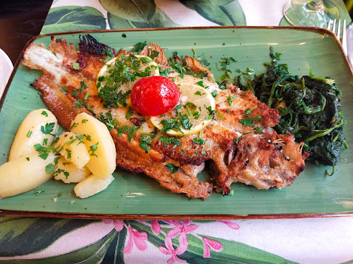 Wir entschieden uns an diesem Abend für die Gerichte aus der Fischkarte – und wurden nicht enttäuscht. Die Vorspeise bestand aus einer kleinen Trilogie von Meeresfrüchten: gratinierte Jakobsmuscheln auf Spinat, gegrillter Pulpo mit lauwarmem Kartoffelsalat und Scampi in pikanter Tomatensauce. Drei Zubereitungen, drei Temperaturzonen, drei Texturen. Die Jakobsmuschel war zart, aromatisch und mit goldgelber Kruste gratiniert, die durch den Spinat eine angenehm erdige Note erhielt. Der Pulpo kam butterzart, mit einer feinen Röstaromatik, auf einem Kartoffelsalat – lauwarm serviert, mit leichter Vinaigrette. Die Scampi lagen in einer mediterran inspirierten Sauce, leicht pikant, aber nicht dominant. Kein Effektgericht, aber ein Auftakt mit kulinarischer Handschrift.