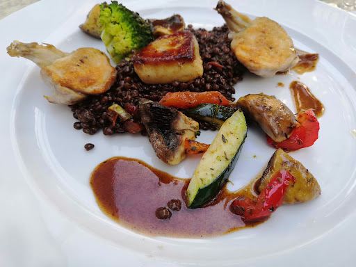 Das Preislevel ist gehoben, aber man findet auch Gerichte fernab vom Standard. Vorab gefielen der Meeresfrüchtesalat (16€) und v.a. die Wachtelbrust auf Belugalinsen mit einem kleinen Stück gebratener Foie Gras (23,50€). Das war ein wirklich schöner Start, zu dem eine geröstete Brioche sicher auch sehr gut gepasst hätte.