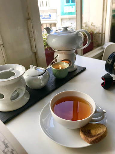 This is the most adorable tea shop I know. If you're outside, the small cute house between all the big ones really stand out. When you come in it smells sweet like flowers because of the tea but not too meddlesome. The service is super friendly and has a great knowledge about tea. You can ask them almost everything, they'll fi'd out wich tea suits you best and tell you about tea drinking traditions all over the world. The tea itself also is very tasty, the quality is, as far as I can say, very good and they have a great variety you can choose from. Upstairs they have a cafe they serve the tea and they don't give you weird looks if you want your tea with cream because they know it tastes better haha They also have things to eat, breakfast, sandwiches and scones which taste incredibly awesome. Not to forget the waffles, they're great too and they serve the cream, cherries etc in bottles so your waffle stays bit crispy. However it is awesome and if you didn't visit yet you...