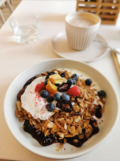 The menu is quite small but so far absolutely satisfying. Perhaps in winter they might consider adding Porridge to the menu. I have ordered the Granola and two Cappuccino. Customer's can order additional coconut Joghurt which I did. The coffee tastes like heaven (I am a Barista myself) and the Granola Bowl was extremely tasty. Personally it did fill me up just so, felt the portion could have been a bit bigger. Quality of the ordered choices has been excellent.