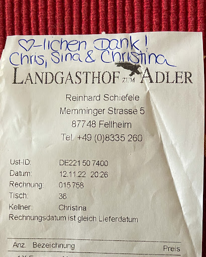 Read moreWir haben durch Zufall auf unserer Heimreise den Landgasthof Adler entdeckt und sind überwältigt und begeistert. Wir hatten Glück einen Platz an diesem herrlichen Frühlingsabend in einem tollen Biergarten unter schönen alten Kastanien ergattert zu haben. Die Angebote aus der Karte haben uns völlig überrascht. Die Entscheidung für ein Frühlingsmenü fiel trotzdem schnell. Geschmacklich der Volltreffer. Alles war perfekt. Wir haben schon sehr sehr lange nicht mehr so gut gegessen. Eine köstliche Vorspeise mit frischem Brot. Beim Hauptgericht ein auf den Punkt gegartes Milchlamm mit einer unvergesslichen Kräuterkruste. Es sind die „Kleinigkeiten“ die in Erinnerung bleiben. Ein köstliches Kartoffelgratin aus hauchzarten Kartoffelscheiben. In Rauten geschnittene knackige Bohnen und einer sämigen Jus. Der herrliche Nachtisch hat alles abgerundet.