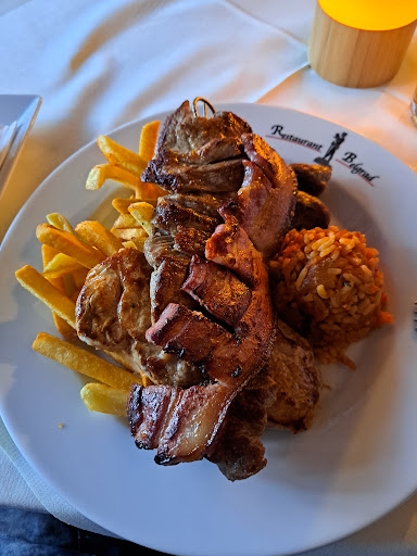 Nach angemessener Zubereitungszeit wurde das Essen und eine Warmhaltplatte gebracht. Mengenmäßig wurden wir erschlagen von den Fleischmassen auf der Platte, wo definitiv für jeden Fleischesser genügend drauf ist. Unter dem Fleisch gab es zwei Kugeln Djuwetschreis und Pommes Frites, die ebenfalls sehr lecker waren. Die Teile aus Hackfleisch waren innen noch leicht rot, wogegen die beiden Fleischstücke aus dem Schweinelachs zu durch waren. Insgesamt war aber alles sehr lecker und wir kommen...