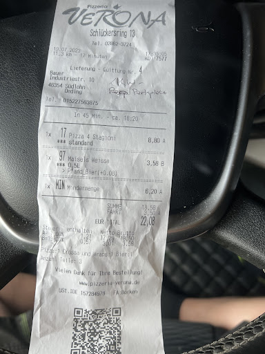 Read moreIch kam und bestellte eine große Pizza - Romantik. Sie war sehr schnell fertig. Der Teig war sehr gut und die Füllung genau richtig. Leider war ich von der Größe negativ überrascht. Die Pizza ist sehr klein. Ich weiß nicht, vielleicht bin ich es in meiner Heimat gewohnt, dass eine große Pizza wirklich groß ist. Seien wir ehrlich, ich habe in fast jedem Land Europas Pizzen probiert. Ich mache meine Pizzen auch sehr erfolgreich selbst. Aber am Ende war es eine der leckersten, die ich in Deutschland probiert habe, und ich kann nicht viel auszusetzen haben, außer dass es schön gewesen wäre, wenn die Pizza in Scheiben geschnitten worden wäre, aber das verstehe ich, sie war heiß, Der Grund besteht also darin, die Füllung nicht zu verschütten Für mich war es etwas problematisch, es so zu essen. Der Pizzameister ist sehr gut, die Verkäuferin auch, die Verpackung ist ein Standardkarton, die Pizza...